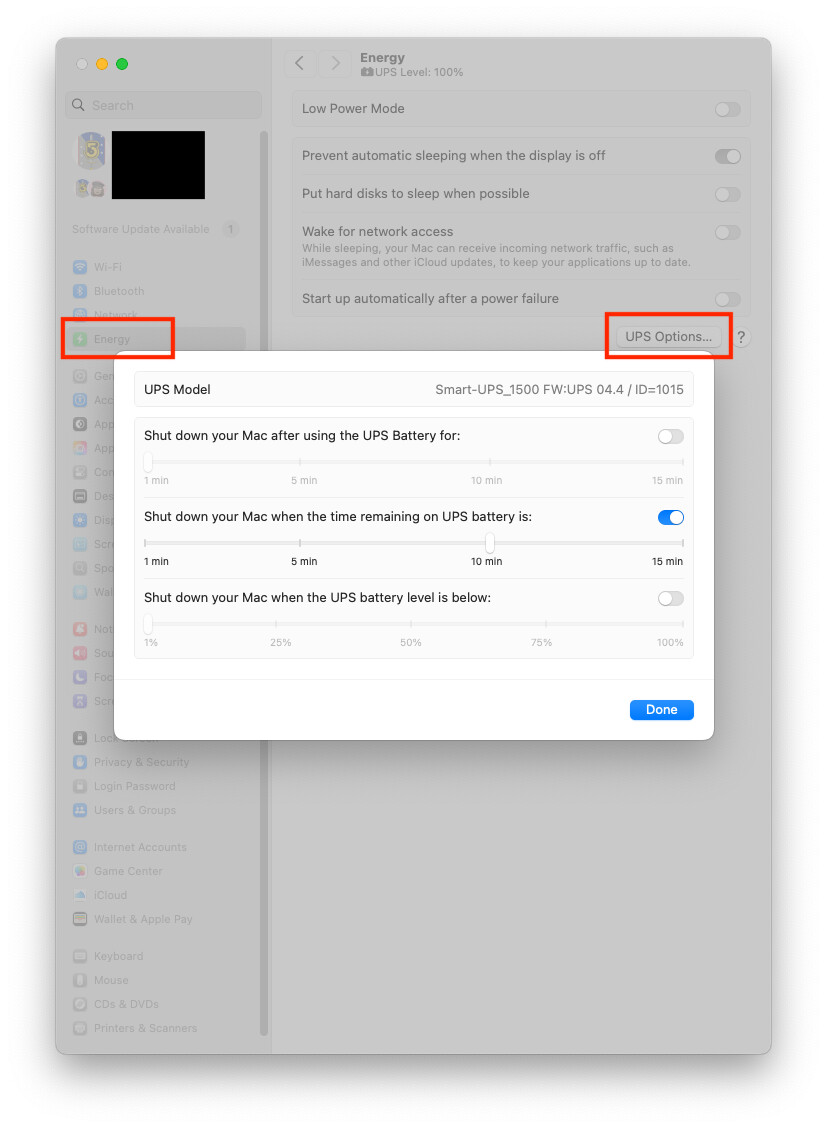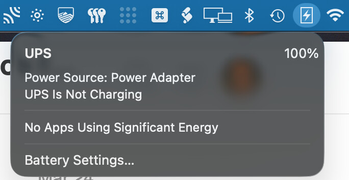 Alas, on my MBP “Energy” is “Battery”, and there is no “UPS Options…” selection. This is on Tahoe, with an APC Back-UPS 750 connected via Bluetooth USB. Instead, I see a menu. As you can see, it offers no further (useful) options.