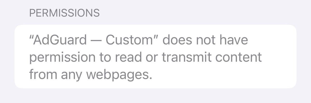 Now that I’ve installed the AdGuard app, I see these permissions texts on most of the modules; this one is for ‘AdGuard — Custom’.