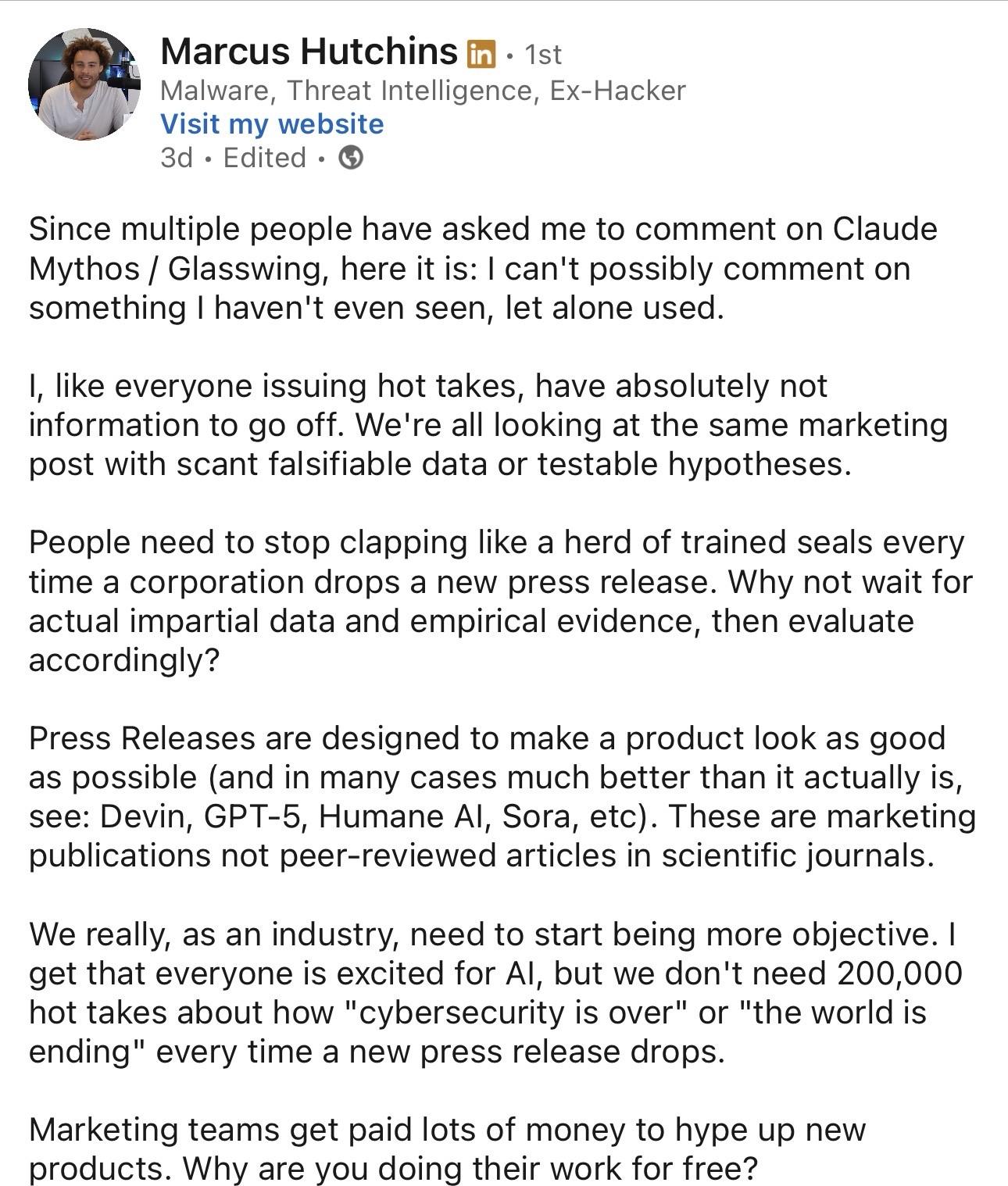 Mythos is concerning and will have implications across every technology you use. We are approaching a point where vulnerabilities and exploits are developed faster than humans can respond, and the tools find flaws humans miss. My advice is to be aware and be prepared to make changes to how you select and manage your personal technology. You’ll want to prefer newer devices and services with good track records of staying up to date.