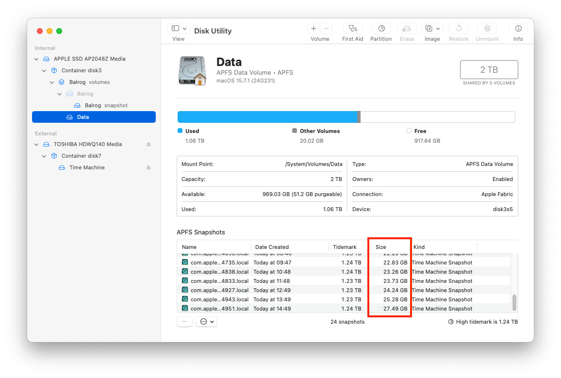 But BackupLoupe knows it without mounting or analyzing the snapshot. I can open BackupLoupe, after not using it at all for months, and it instantly knows the size of every snapshot. How is it figuring it out?