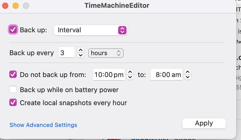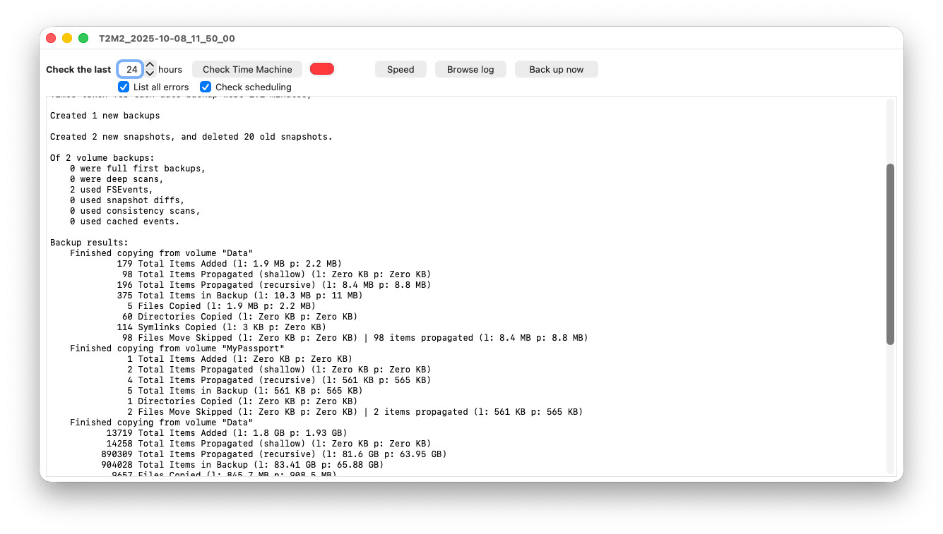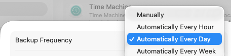 Back to the topic at hand… I’m using TimeMachineMechanic to perform a daily backup. I find it’s more predictable than the macOS Time Machine preference setting of daily. I found that the macOS setting caused the backup time to drift (due to sleep or logoff perhaps) away from when I wanted it.