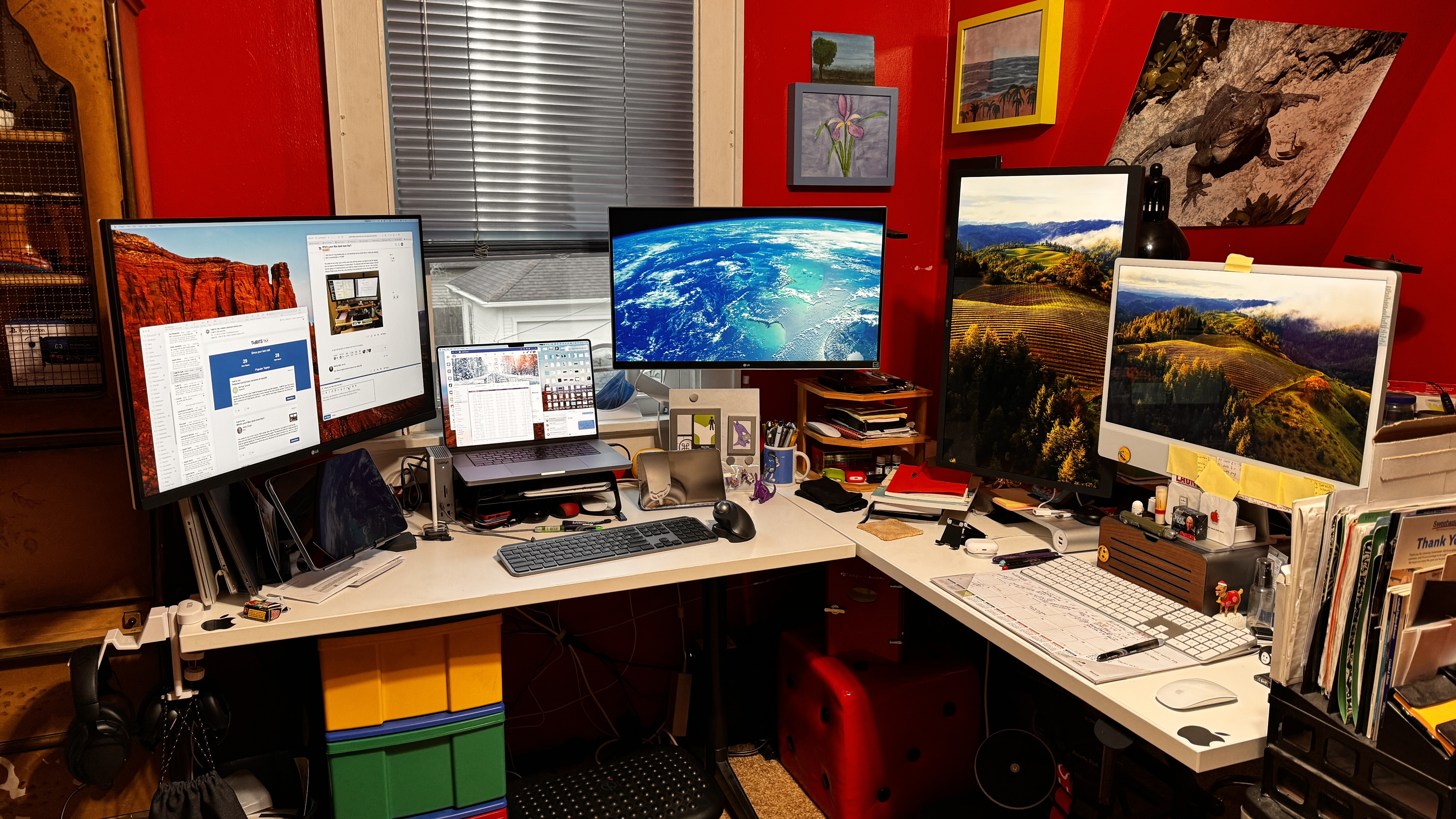 I just have to say that I’m enjoying this topic immensely, and I’m thinking about writing about it in TidBITS to solicit even more photos. It’s fascinating to get a little glimpse into the lives of TidBITS readers through these photos, which are easily interpretable to those of us who have set up multiple desks over the years. You can tell who prints a lot, who like a super clean workspace, who focuses everything on a single machine versus having multiple machines around, and so on. And so many multiple monitor setups!