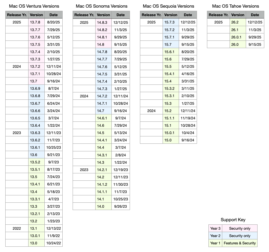 @josehill you are correct. I hadn’t reviewed the entire list at the time of my post, only the first (most recent) 25 items. Of the 119 listed, about 76 are dated Sept. 2025 or newer and do pertain to Apple’s software, with several seeming to be non-trivial. Adjusting the search parameters to focus on MacOS 26.2 returns a list of 41 CVEs, but all of them are 2024 or older and almost entirely third-party software such as Adobe Flash.
