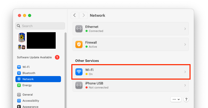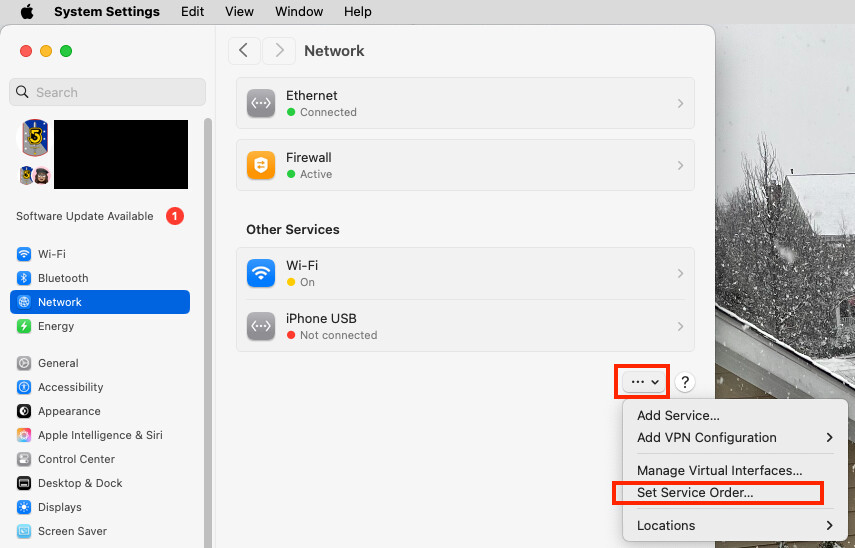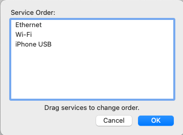 “Set Service Order” is an “additional option” under an clickable button designated by an unnamed ellipsis. When I activate that, the services are listed in roughly the same order as they appear at Settings>Network (with “Wi-Fi” well below Ethernet, in fourth position, but when I ask maps to locate me with Wii-Fi turned OFF, the computer has no idea where I am. Does that mean that because the request cannot be resolved by my primary network connection it’s passed to Wi-Fi? I don’t disconnect my Cat6 cable when I select “Wi-Fi” from the MenuBar and “light up” the Wi-Fi Chevron.
